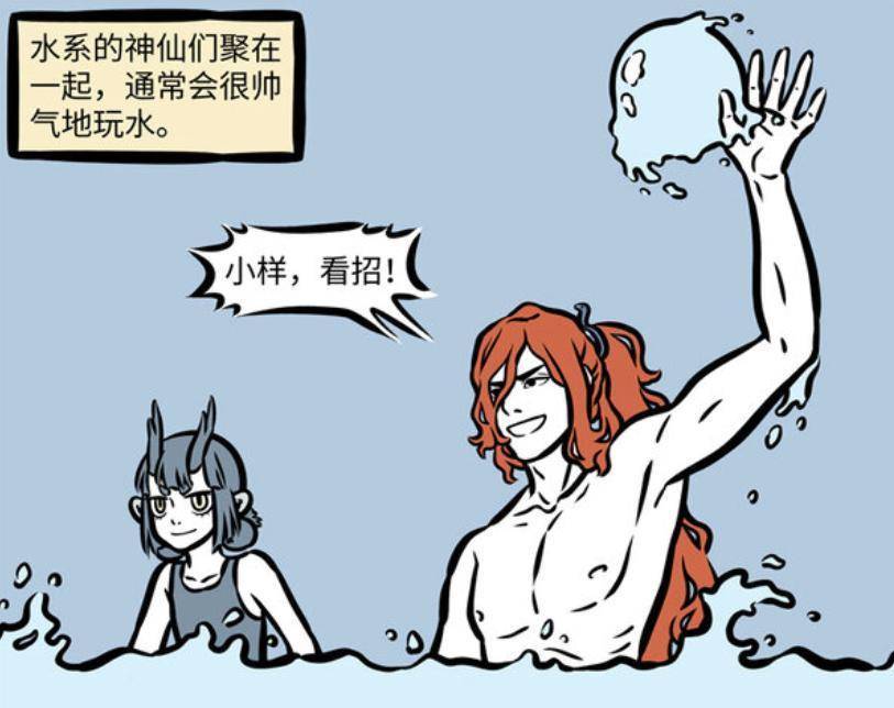 水系神仙偶尔会相聚,龙女、共工、敖烈和玄武关系很好。他们会在海边相聚,一起帅气地玩水。能看出共工直接将水化为水球,还和龙女是队友。就像玩沙滩排球一样,只是把场地换成海,把球换成水球。共工对自己技术很有信心,觉得敖烈和玄武未必能挡下他这一球。