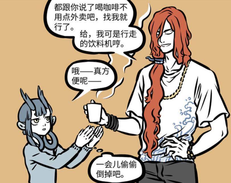 做好咖啡后,共工把它交给龙女。共工表示,咖啡根本不用点外卖,找他就行。他再次强调自己是行走的咖啡机,想喝咖啡随时找他。龙女没直接反驳,只说这样确实方便。不过龙女内心想法是,待会找机会偷偷倒掉。