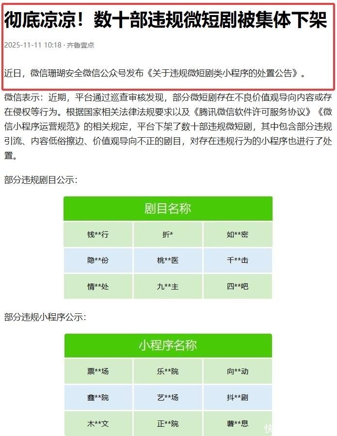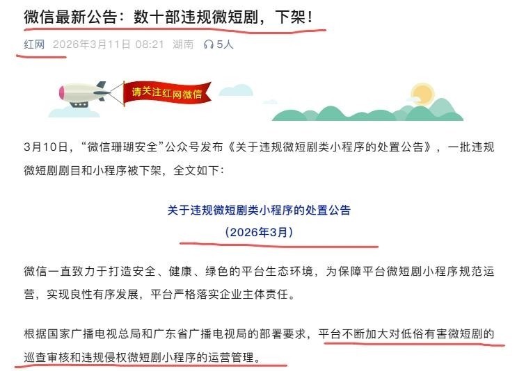 与此同时,“红网”官方亦发布专项通告:微信生态内数十部违规微短剧已全部关停,并升级技术审核机制,强化对涉未成年人有害内容、版权侵权及价值观偏差类作品的识别与拦截能力。
