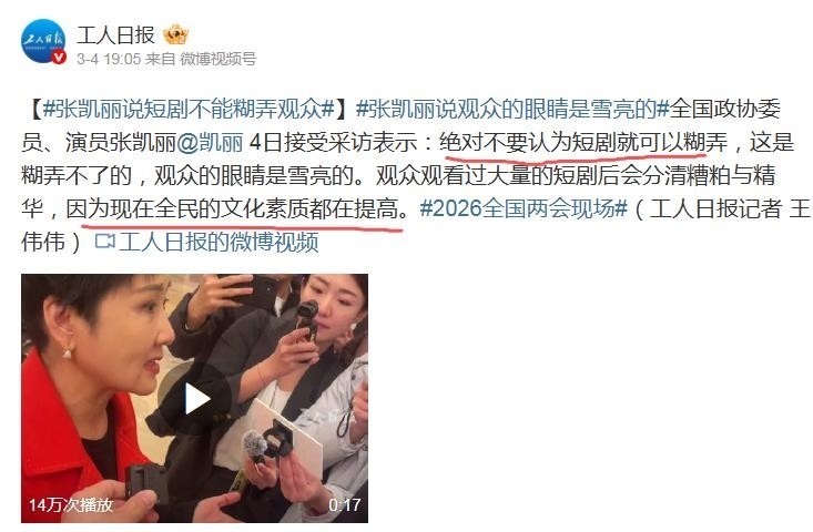 张凯丽指出:短剧演员同样需要真功夫,绝不能因时长缩短就降低表演标准。全民审美水准持续跃升,观众早已不是被动接受者,而是具备专业鉴赏力的内容共治者。