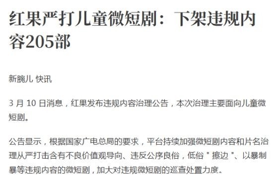 3月10日,“红果短剧”平台率先启动内部清查,主动下线违规微短剧205部,重点聚焦面向未成年人群体的内容治理。